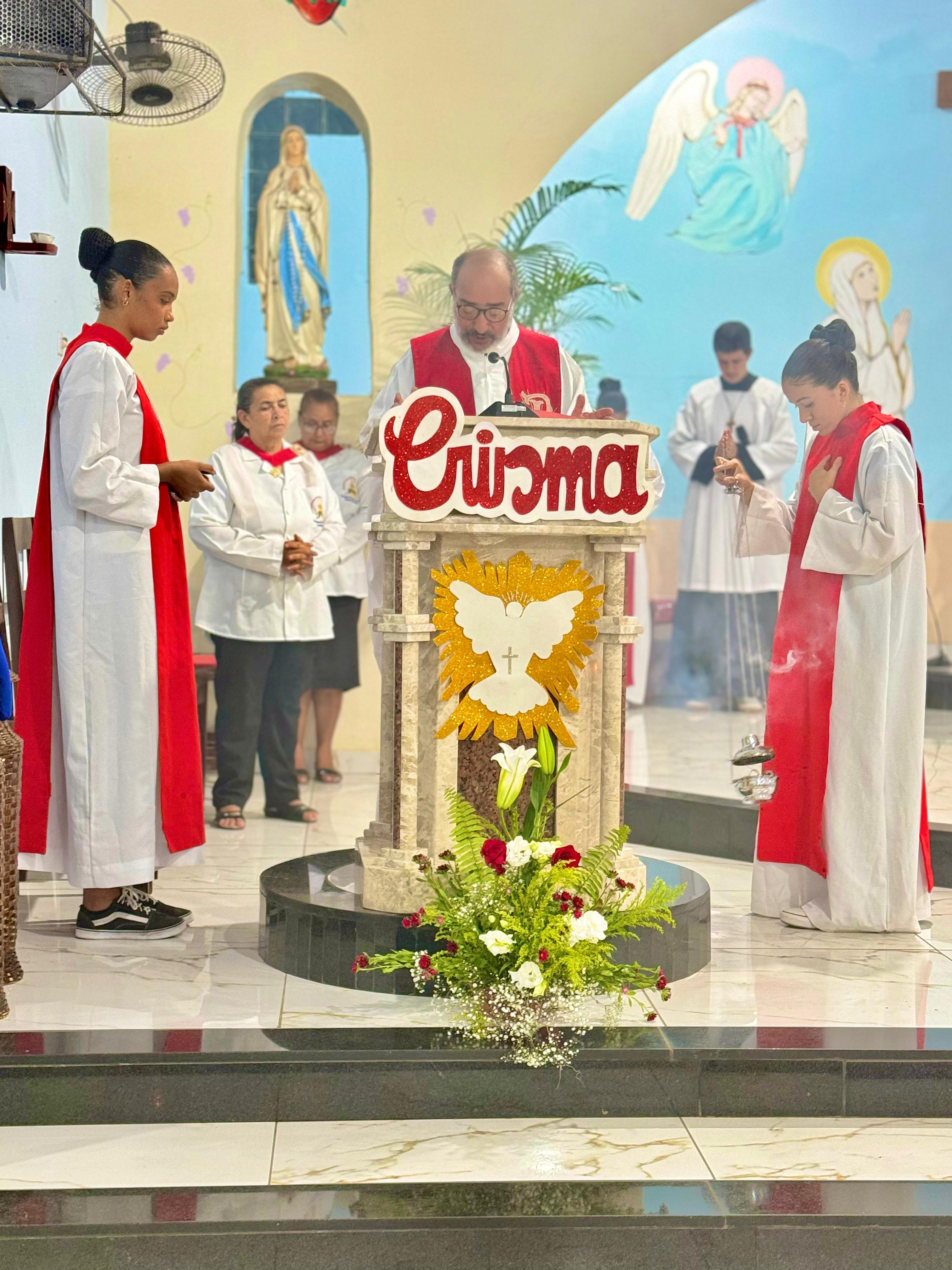 Nesta quarta-feira, 4 de dezembro, a Paróquia Nossa Senhora de Lourdes, que tem como pároco Padre Figueredo, realizou uma significativa celebração marcada pelo sacramento da crisma, que reuniu 17 crismandos, entre eles jovens e adultos. Além da crisma, também aconteceu o sacramento da primeira eucaristia, um momento especial para os jovens e adultos que se prepararam para receber o Corpo e Sangue de Cristo.